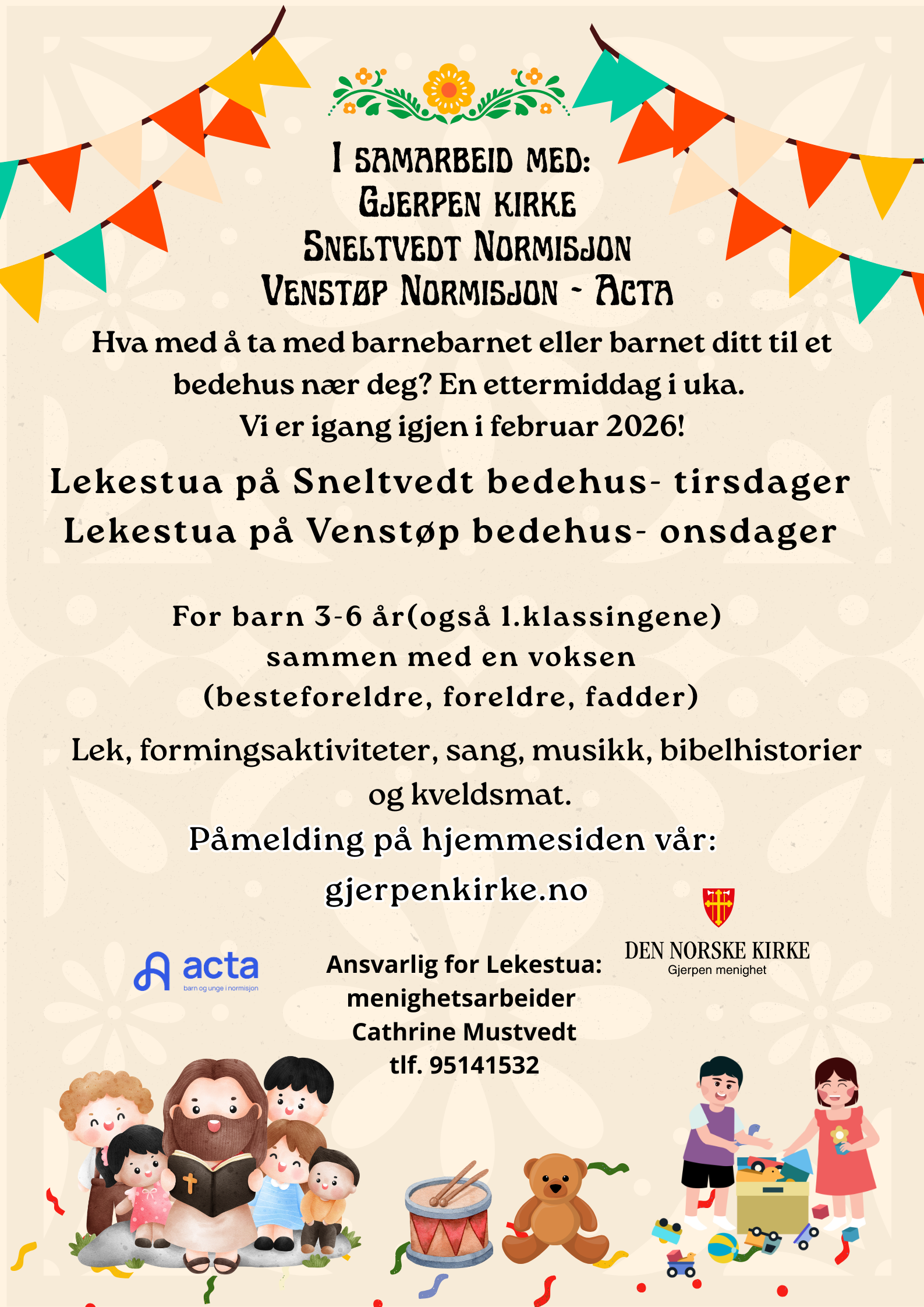 Vil du være med? Vi setter i gang igjen i februar 2026! Sneltvedt Lekestue tirsdager kl.17.00-18.30 på Sneltvedt bedehus! Venstøp Lekestue onsdager kl.17.00-18.30 på Venstøp bedehus!