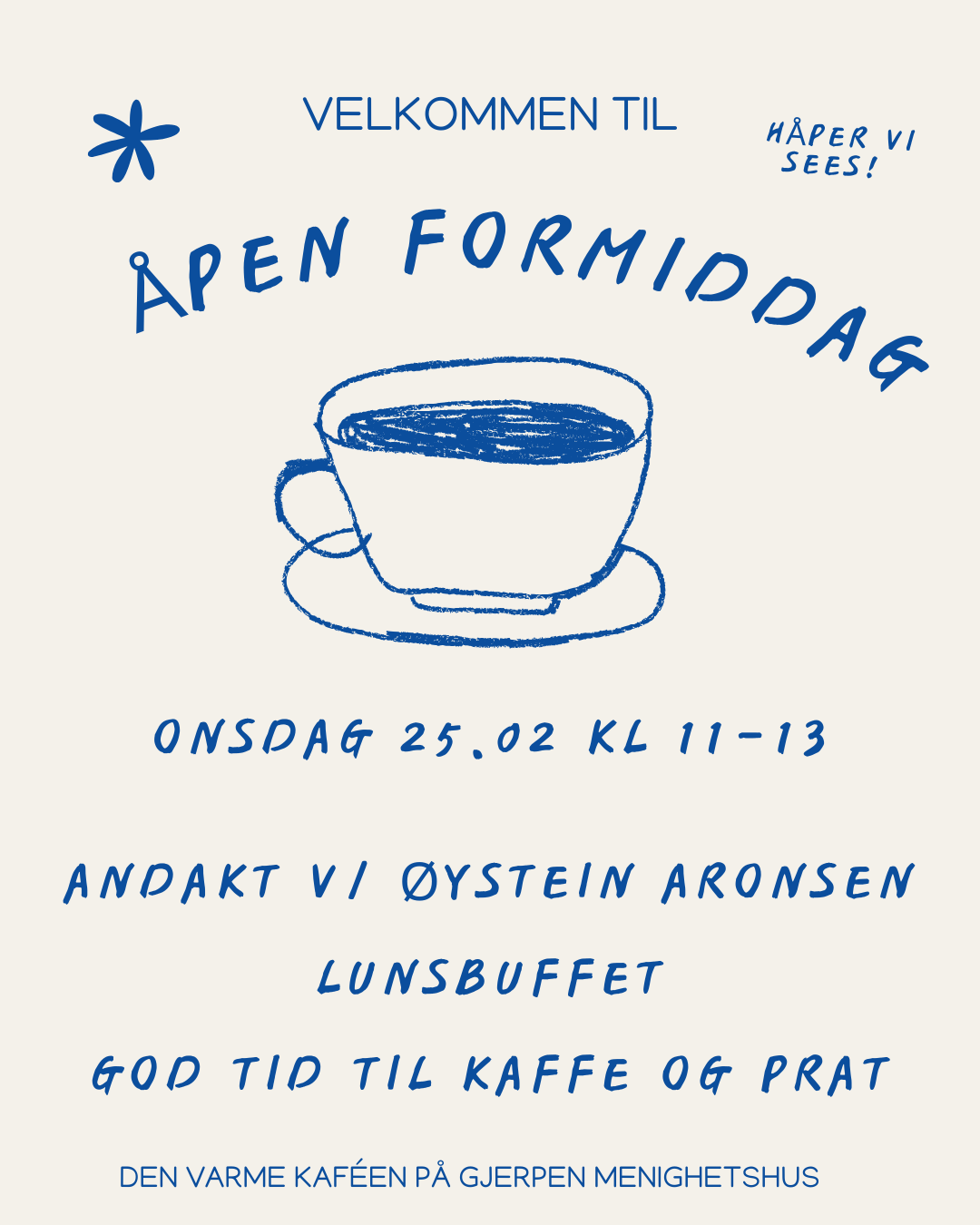 Velkommen til åpen formiddag 25. februar kl. 11-13 - i Den varme kaféen på Gjerpen menighetshus Andakt av Øystein Aronsen Salg av deilig lunsjbuffet Håper vi sees!